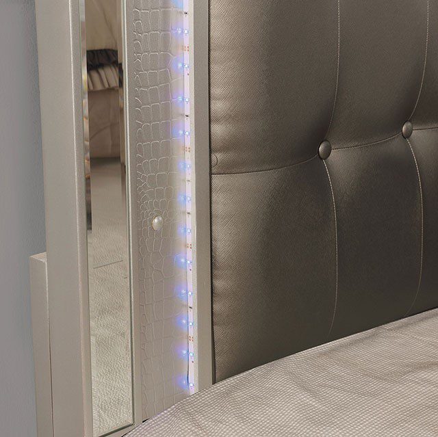 Get the most out of your bedroom with this contemporary style bedroom set. The button tufted leatherette headboard offers unlimited comfort so you can lean into it in any angle. The LED light trim on the headboard adds a tasteful sense of convenience for your nightly reading materials. The decorative mirror accents and ornate bun feet compliment these stylish features and the felt-lined top drawers blend traditional elements well.