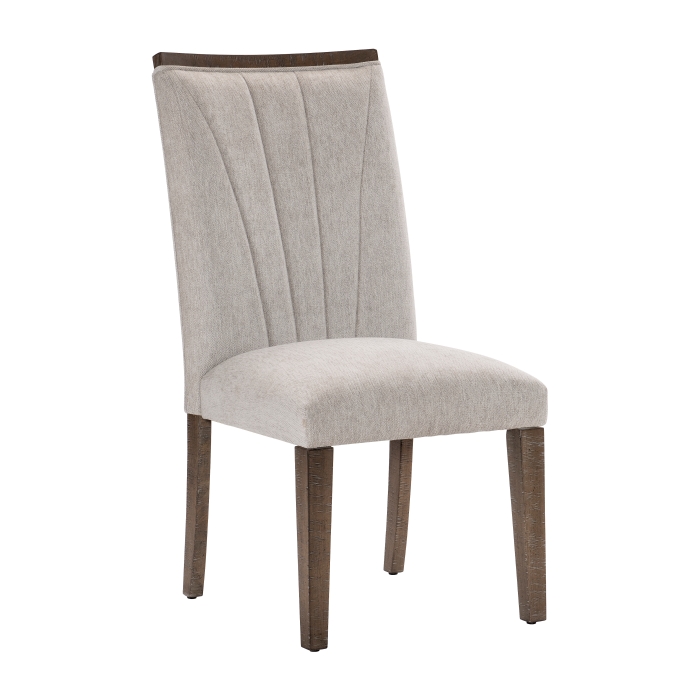 At the intersection of modern and rustic design, the Gresham Collection brings you to a full stop. Clean lines are paired with the natural beauty of acacia veneer, while a gray finish lends neutral versatility to the décor of your casual dining room. The side chair features wood legs and beige fabric upholstered seats, with profile-defining nailhead trim.