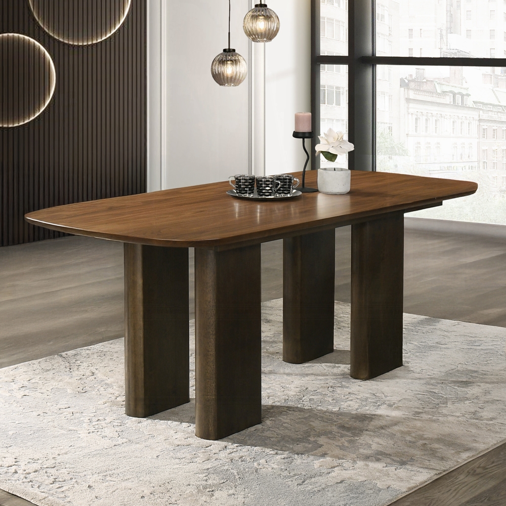 Crafted from solid rubber wood and finished with walnut veneer, the Delina Dining Table showcases a rich, warm tone that complements various interior styles. The addition of chenille accents adds a touch of texture and depth, enhancing its visual appeal.
