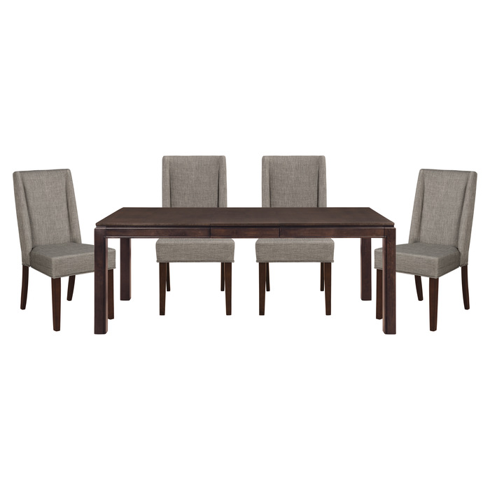 Complementing the table are four side chairs upholstered in soft gray fabric. The shallow cove-back silhouette provides subtle contouring for comfort while reinforcing the collection’s modern aesthetic.