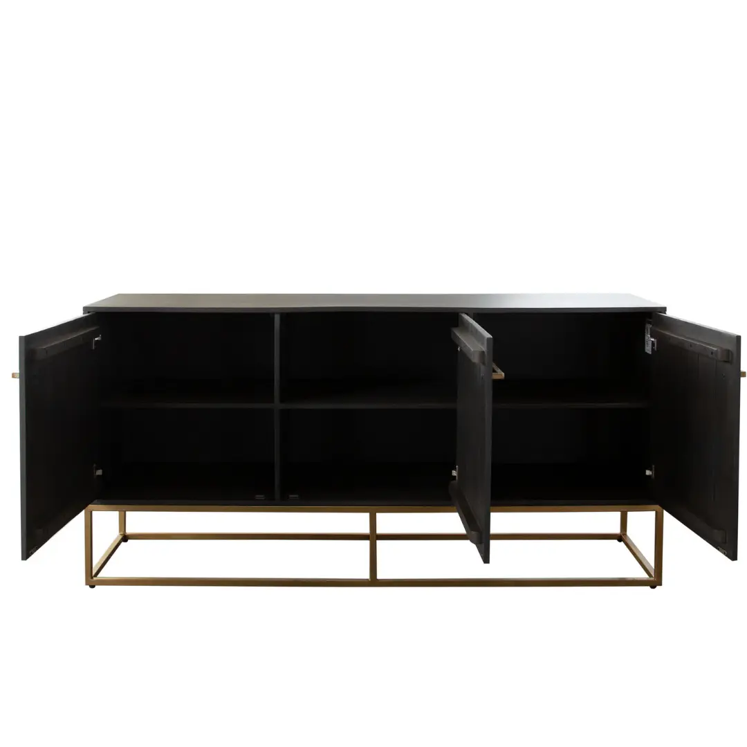 The distressed gold metal handles and base add a subtle touch of glamour without overpowering the clean design. These metallic accents create a warm contrast against the grey finish, making this grey sideboard a standout focal point in any dining room or open-concept living space.