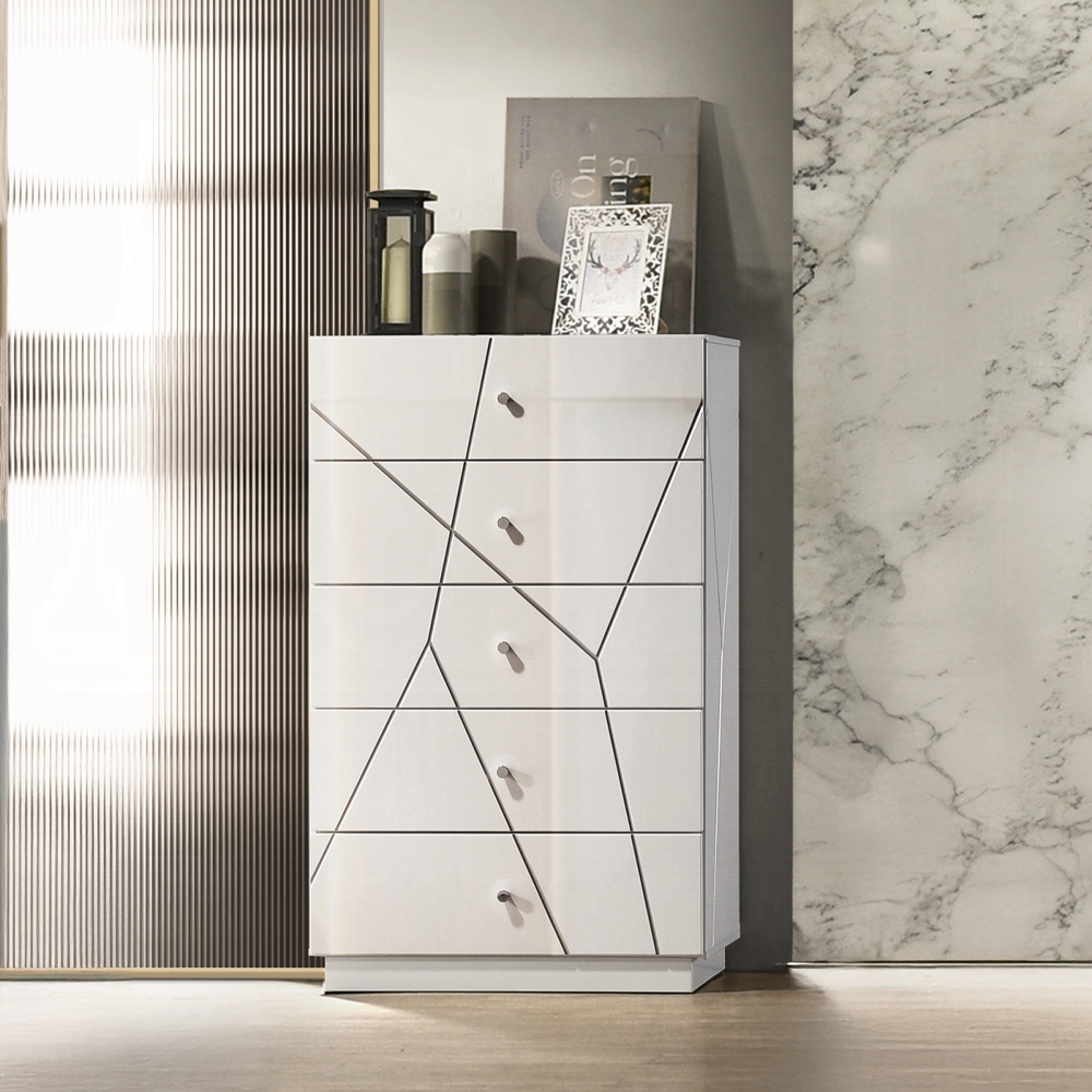 Constructed from durable MDF and metal, this chest offers stable vertical storage without overwhelming the space. Its slimmer depth (18″) and statuesque height (50″) make it ideal for bedrooms where floor space is premium. It fits beautifully alongside the matching dresser, nightstand, and bed in the high-gloss suite.