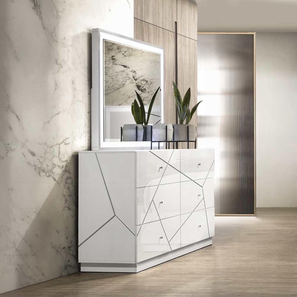 The dresser’s white and silver high-gloss lacquer ensures a luminous, upscale look. Subtle embossed line detailing adds depth and aligns its aesthetic with the rest of the furniture collection.