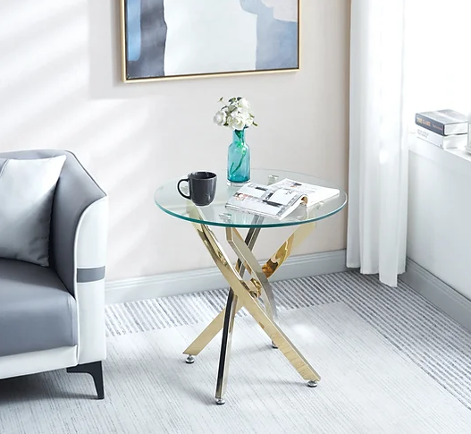 the perfect table for sectional sofa setups and stylish interiors. Featuring a sleek 10 mm clear tempered glass top, this round table brings modern elegance to any room. Its sturdy 201 stainless steel frame, finished in radiant gold, adds a touch of luxury and durability. Whether used to display decor, hold beverages, or complement your seating arrangement, this artisan-crafted table seamlessly combines function and style. Enhance your living room with a sophisticated piece designed to stand out while blending effortlessly with your sectional sofa.