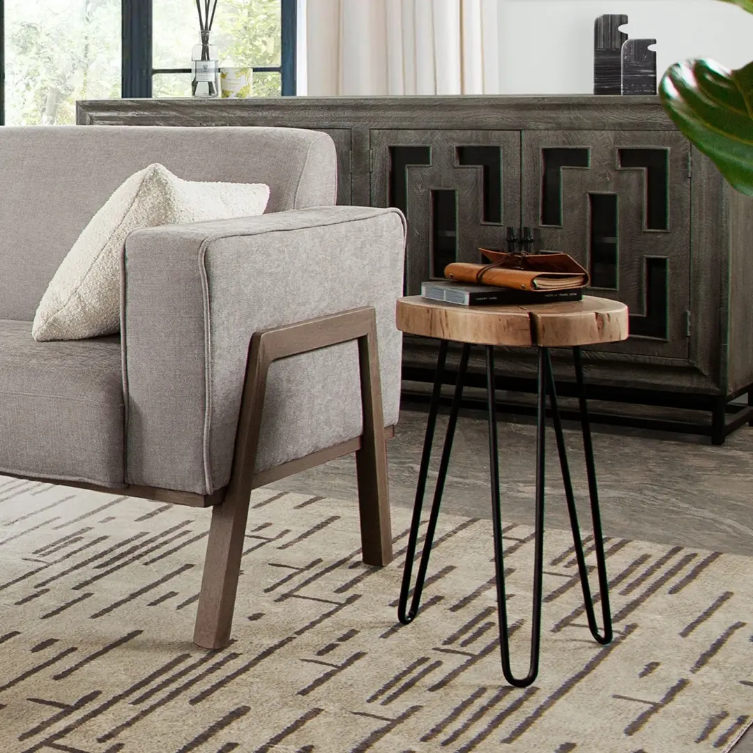 Bring natural elegance and modern simplicity into your living space with the Joss Natural Acacia Modern End Table by Diamond Sofa. Crafted with a solid acacia wood top and black powder-coated hairpin legs, this one-of-a-kind accent table combines organic beauty with industrial flair. Its live edge design preserves the natural charm of the wood, making each table uniquely striking. Perfect for contemporary, modern, or vintage-inspired interiors, this table enhances any room while providing functional style.