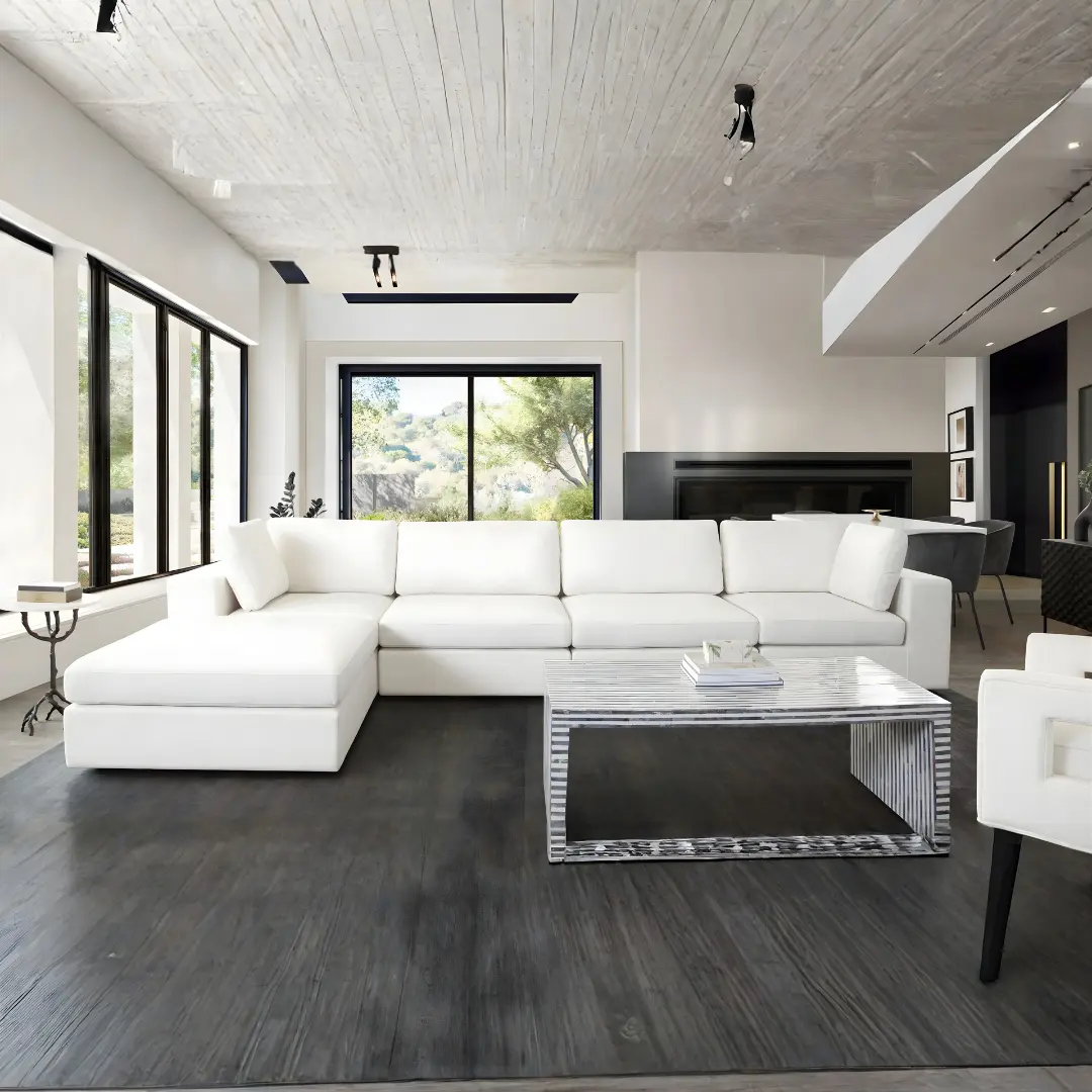 Upgrade your living space with the Muse 5PC Corner Sectional, a stunning 5 piece sectional sofa from Diamond Sofa’s Muse Modular Collection. Designed for modern living, this sectional offers versatile configurations to perfectly fit your room while maintaining a crisp and sophisticated look. Choose between the timeless Mist White Performance Fabric, which resists wear and blemishes, or the luxurious Winter Mink Performance Velvet for a warm, elegant touch.