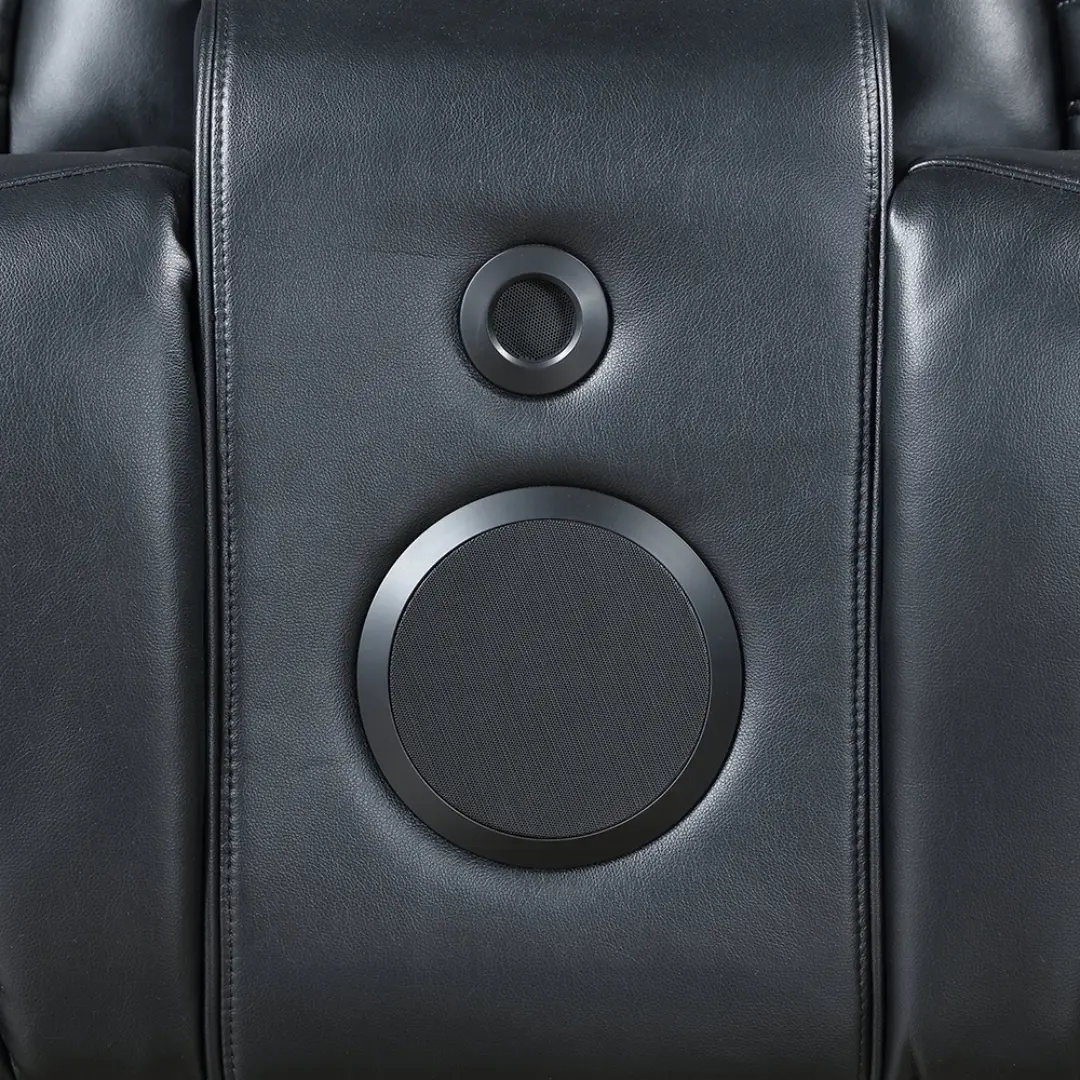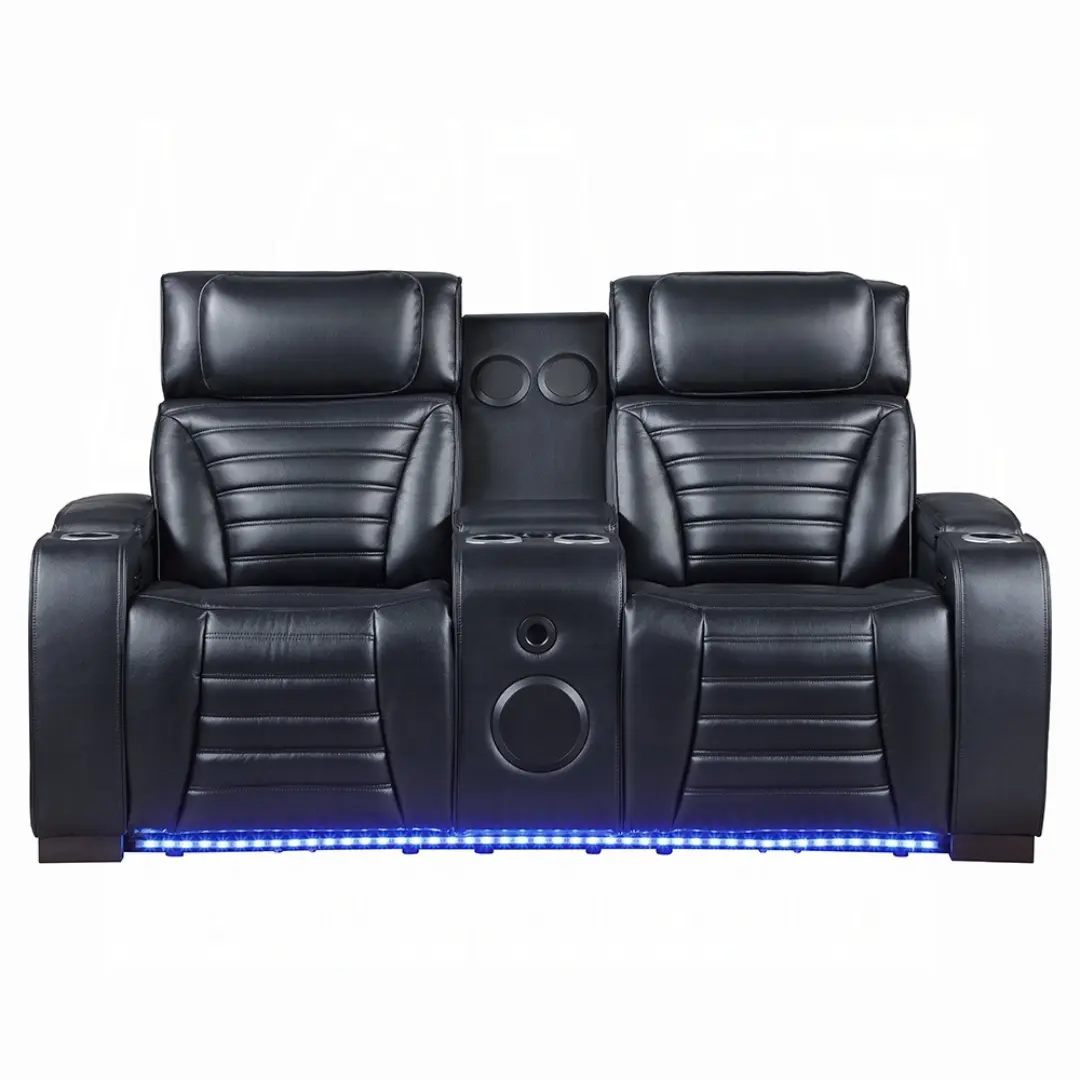 Upgrade your living room with this feature-packed recliner loveseat with console, designed for luxury relaxation and modern convenience. Upholstered in sleek Black Leather Aire and built with a durable wooden inner frame, this loveseat combines smooth power reclining with advanced tech features for the ultimate home theater experience.