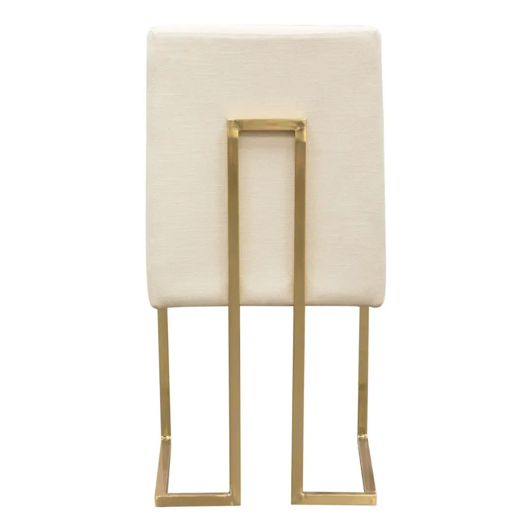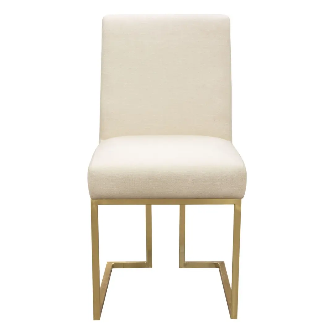 The brushed gold metal frame provides a striking contrast against the cream fabric, adding a sophisticated metallic touch to your dining room. The polished metal legs are sturdy and designed for stability, giving you confidence in both form and function.