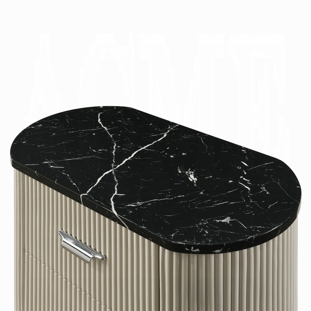 The marble print accents add a touch of modern glam. This nightstand’s design seamlessly integrates with various bedroom aesthetics, making it a perfect addition to your home.