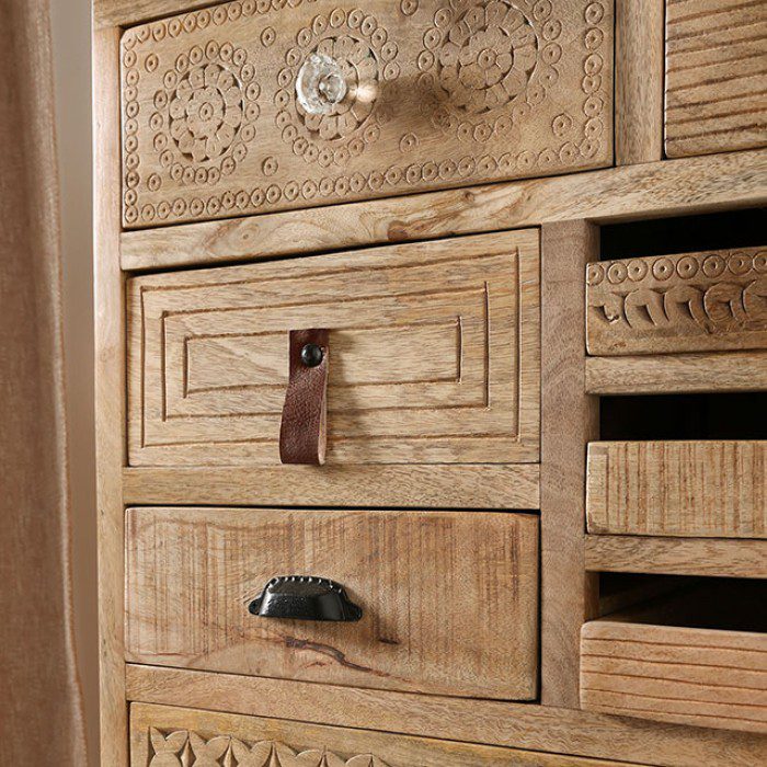Ten drawers. Yes, we counted, and based on that fact alone, it is safe to say that this dresser is out of the ordinary. Everything about this piece is original–from the multifaceted panels to the odd mix of reclaimed hardware. It is made of solid wood and finished in a light natural tone meant to emphasize the quirkiness not just of its hand-carved patterns and knobs, but also of its natural spalted grain.
