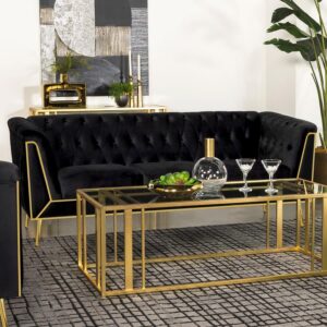 Complete an upscale living space with the luxe look and feel of a modern glam armchair. Plush black velvet upholstery and button tufting create a rich, elegant presentation and perfectly augments the mid-century character of its silhouette. Tuxedo arms create a sheltered effect and flair slightly, emphasized with geometric trim work in gleaming gold that highlights the front of the chair. Splayed metal leg match, adding a sophisticated, vintage inspired vibe. Plush foam cushions complement webbing support, and the seat is further equipped with sinuous spring for optimal comfort and support.