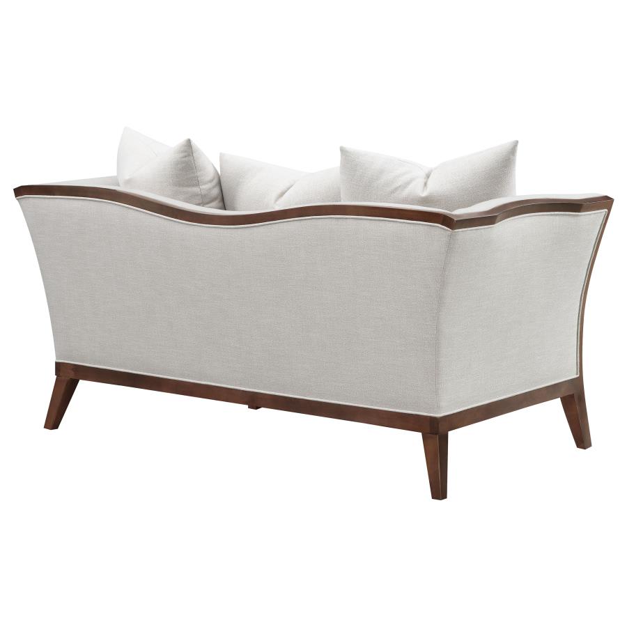Add transitional inspiration to a casual space with a beige loveseat designed to coordinate with an ensemble or stand as a solo piece. Embrace a romantic silhouette with a hint of contemporary attitude. Flared shelter arms featuring a subtle curved inset frame and reversible bench seat cushion offers a dimensional look with chic outlines. Coffee finish wood trim creates shaping that contrasts with soft beige fabric, as three eco-friendly and animal friendly Trillium blend fill pillows add luxury. Choose this loveseat breathe calm living enjoyment into a compact space.