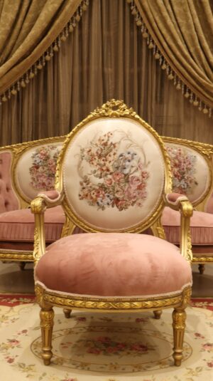 - Material: natural beech wood, embroidery, velvet, upholstery, barss