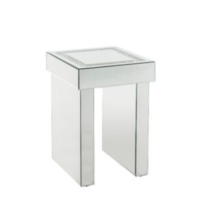 Go full glam with this Noralie End Table. The beautiful mirrored finish and glistening faux diamonds inlay will reflect light and make any room appear larger. It provides a spacious table top ample enough for displaying various decor items while the sled base gives the table a stylish and sturdy support. The detailed border with faux diamonds inlay on the top achieves a gorgeous glam style. Adds light and shine to your room decor with the Noralie End Table.